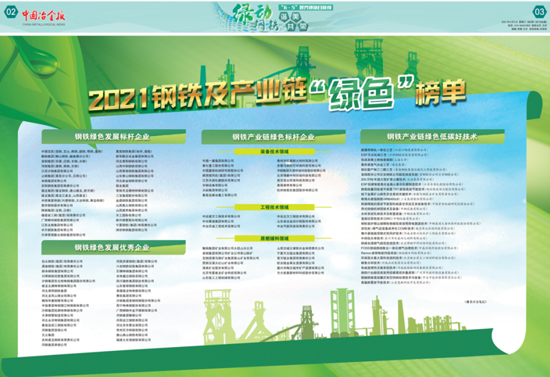 近期中國(guó)冶金報(bào)公布了2021年度中國(guó)鋼鐵品牌企業(yè)和2021年度鋼鐵及產(chǎn)業(yè)鏈“綠色”標(biāo)桿企業(yè),我公司雙雙上榜。5月10日,第5個(gè)中國(guó)品牌日,公布了2021中國(guó)鋼鐵品牌榜單,公司再次榮獲中國(guó)鋼鐵工程技術(shù)類(lèi)“優(yōu)秀品牌供應(yīng)商”榮譽(yù)稱(chēng)號(hào),我公司已經(jīng)連續(xù)兩年獲得中國(guó)鋼鐵工程技術(shù)類(lèi)優(yōu)秀品牌企業(yè)。6月5日,世界環(huán)境日,公布了2021鋼鐵及產(chǎn)業(yè)鏈“綠色”榜單,公司榮獲中國(guó)“鋼鐵產(chǎn)業(yè)鏈綠色標(biāo)桿企業(yè)”稱(chēng)號(hào)。