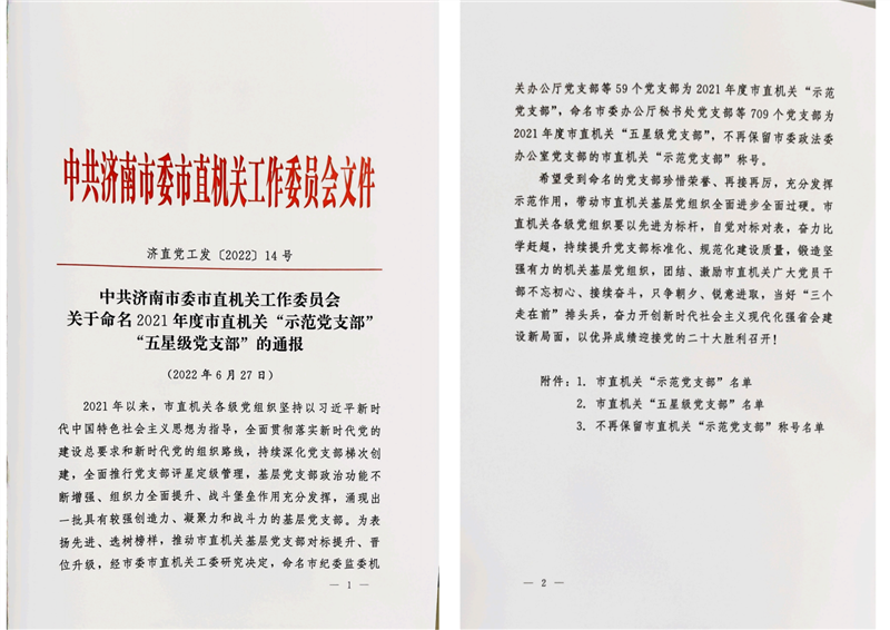 市委市直機(jī)關(guān)工委印發(fā)的《關(guān)于命名2021年度市直機(jī)關(guān)“示范黨支部”、“五星級(jí)黨支部”的通報(bào)》(濟(jì)直黨工發(fā)〔2022〕1號(hào)文)中,授予我單位熱風(fēng)爐工程技術(shù)分公司黨支部、焦化事業(yè)部黨支部、耀華能源公司黨支部、土建設(shè)計(jì)一部黨支部、土建設(shè)計(jì)二部黨支部、職能管理第一黨支部、公司辦公室黨支部、電氣設(shè)計(jì)部黨支部、經(jīng)營管理黨支部、職能管理第二黨支部共10個(gè)黨支部為“五星級(jí)黨支部”。獲獎(jiǎng)支部將繼續(xù)發(fā)揮示范作用,團(tuán)結(jié)激勵(lì)支部黨員,不忘初心、勇于擔(dān)當(dāng),努力為公司發(fā)展做出更大貢獻(xiàn)。